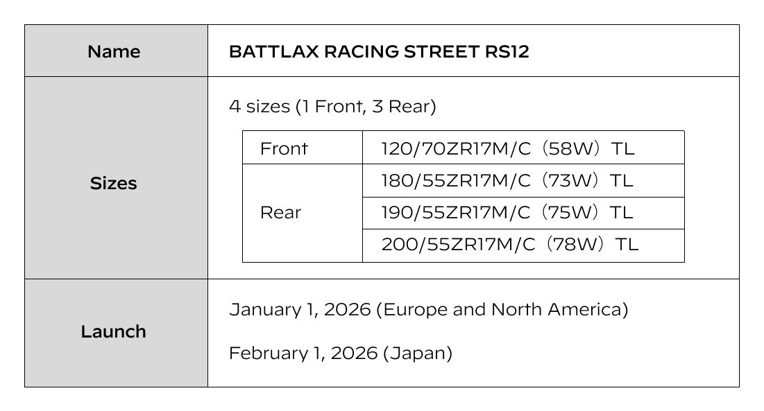 A Bridgestone Corporation (Bridgestone) ma bejelentette, hogy 2026 januárjában piacra dobja a prémium sport motorkerékpár-abroncsot, a BATTLAX RACING STREET RS12-t az európai és észak-amerikai piacokon, 2026 februárjában pedig a japán piacon. A „versenypályáról az utcára” koncepció jegyében a BATTLAX RACING STREET RS12 a versenyabroncs-technológia beépítésével a legmagasabb szintű száraz tapadást nyújtja a BATTLAX közúti használatra engedélyezett abroncskínálatában.